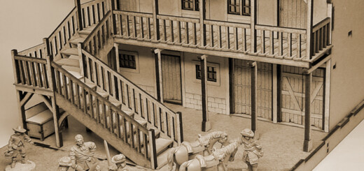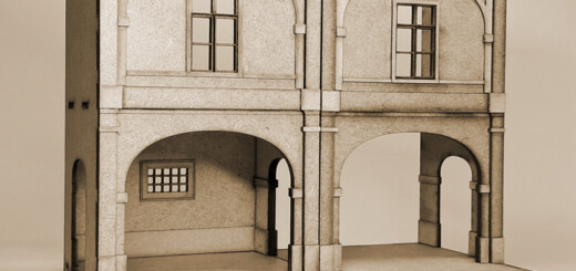 The ground was textured and painted to match the sample terrain tiles. The module on the left has an open arcade which is a pedestrian walkway and it has some paving slabs. The module in the middle is the entrance archway. I gave it more paving slabs and cobblestones as it’s the roadway into the courtyard. But my paving stone laying is all very rough and ready! Like the multiple use nature of the paving stone tiles, these façade walls will be useful for many a courtyard and street scene.